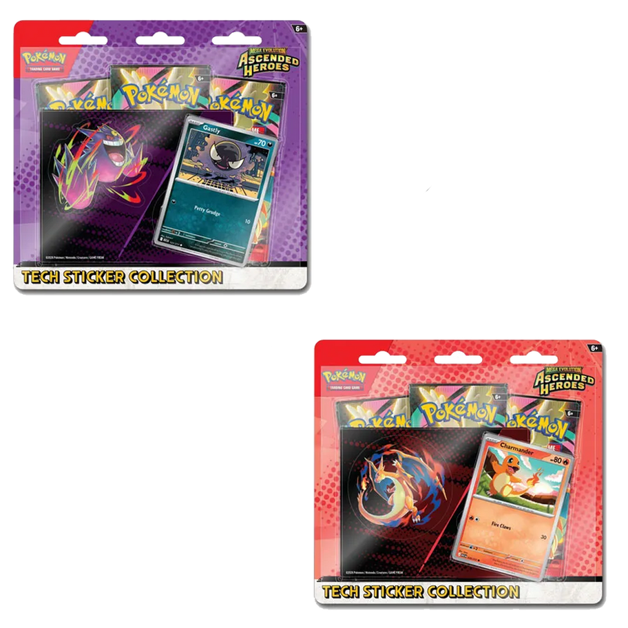 Pokémon from the Kanto region are ascending to greatness—as both promo cards and tech stickers! In this collection, you’ll find either Charmander or Gastly as a foil promo card, plus a sheet of tech stickers featuring Charmander and Mega Charizard Y or Gastly and Mega Gengar. Top it all off with even more Pokémon inside three booster packs from the special Mega Evolution—Ascended Heroes expansion!