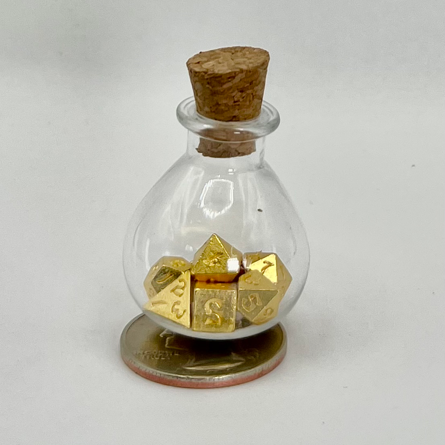 Small clear Potion Bottle with working cork filled with a set of gold tiny dice.