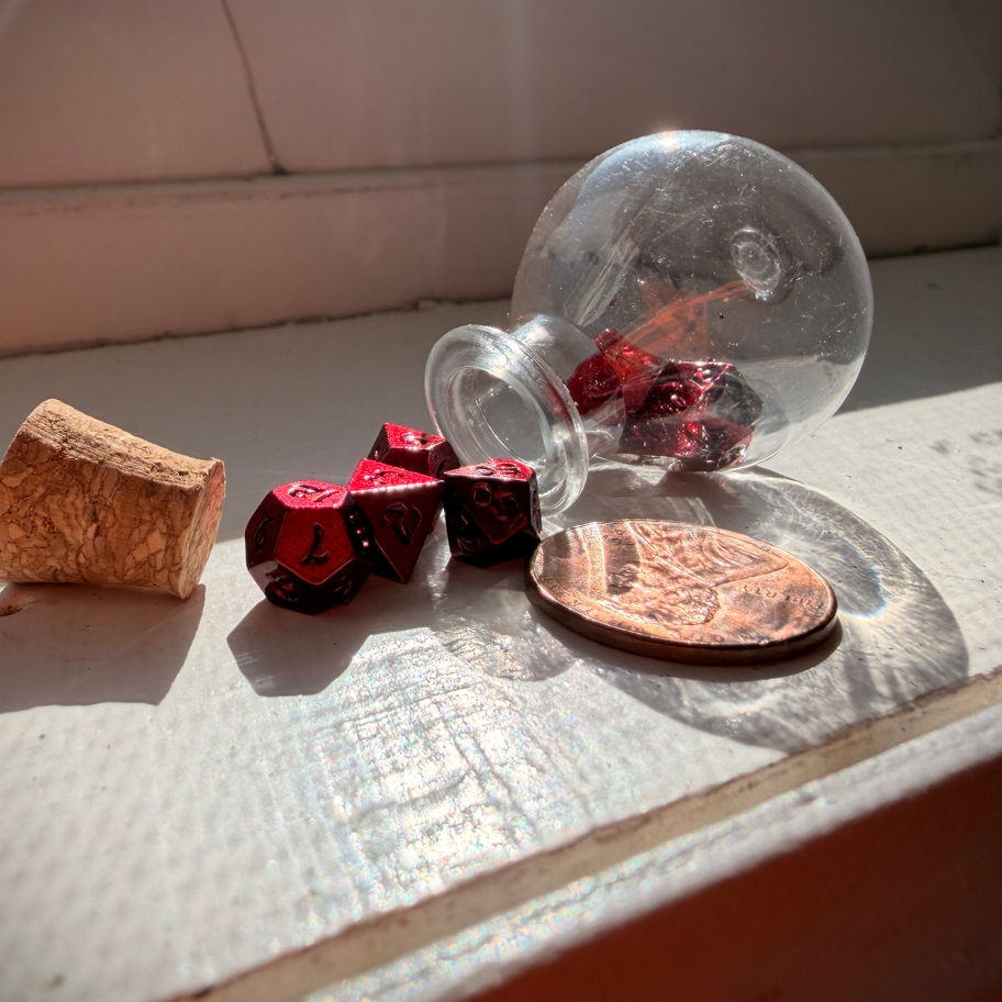 Small clear Potion Bottle with working cork filled with a set of gun metal tiny dice.